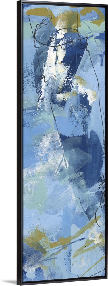 <p>Vertical abstract painting in cool blue shades with contrasting yellow.</p>