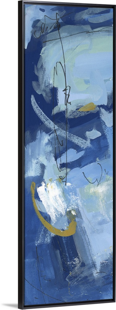 <p>Vertical abstract painting in cool blue shades with contrasting yellow.</p>