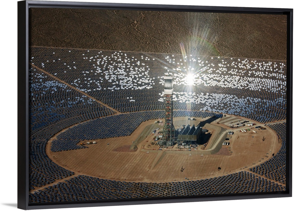<p>Concentrating solar power plant. Heliostat (mirrors with sun-tracking motion) arrays and receiver tower at a concentrating solar power (CSP) plant. CSP plants use heliostats to reflect sunlight and concentrate it on to a central receiver mounted at the top of a tower. The concentrated solar energy is then used to produce electrical power. Here it boils water in the receiver to produce steam, which is piped to a steam turbine generator to convert the energy to electricity. The steam from the turbine is then condensed and pressurized back into the receiver. Photographed near Ivanpah, Mojave Desert, California, USA.</p>