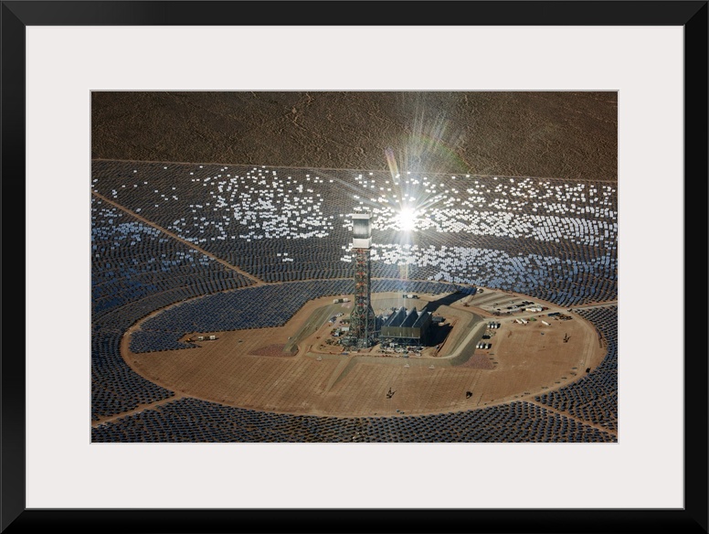 <p>Concentrating solar power plant. Heliostat (mirrors with sun-tracking motion) arrays and receiver tower at a concentrating solar power (CSP) plant. CSP plants use heliostats to reflect sunlight and concentrate it on to a central receiver mounted at the top of a tower. The concentrated solar energy is then used to produce electrical power. Here it boils water in the receiver to produce steam, which is piped to a steam turbine generator to convert the energy to electricity. The steam from the turbine is then condensed and pressurized back into the receiver. Photographed near Ivanpah, Mojave Desert, California, USA.</p>