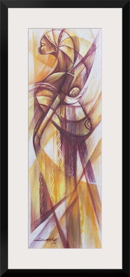 <p>Tall and dignified, a young mother carries her baby wrapped snug in a shawl on her back. She lulls the child to sleep by walking, Bright Dankyi Mensah says. I used earth colors to make this look more natural. His style is cubist, yet it reveals the influence of traditional West African art. You will never love anyone the way you love your baby, the artist confides.</p>