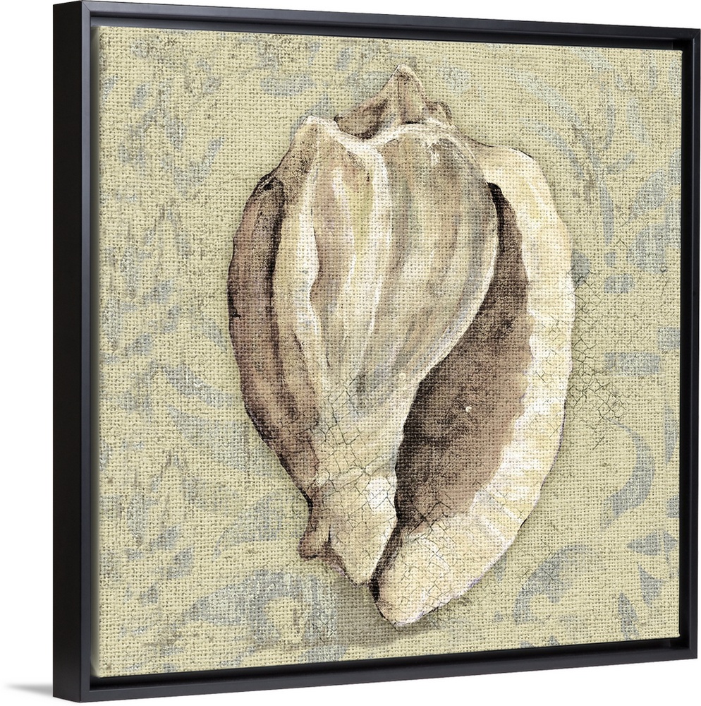 <p>Artwork of a beige seashell against a cream colored background.</p>