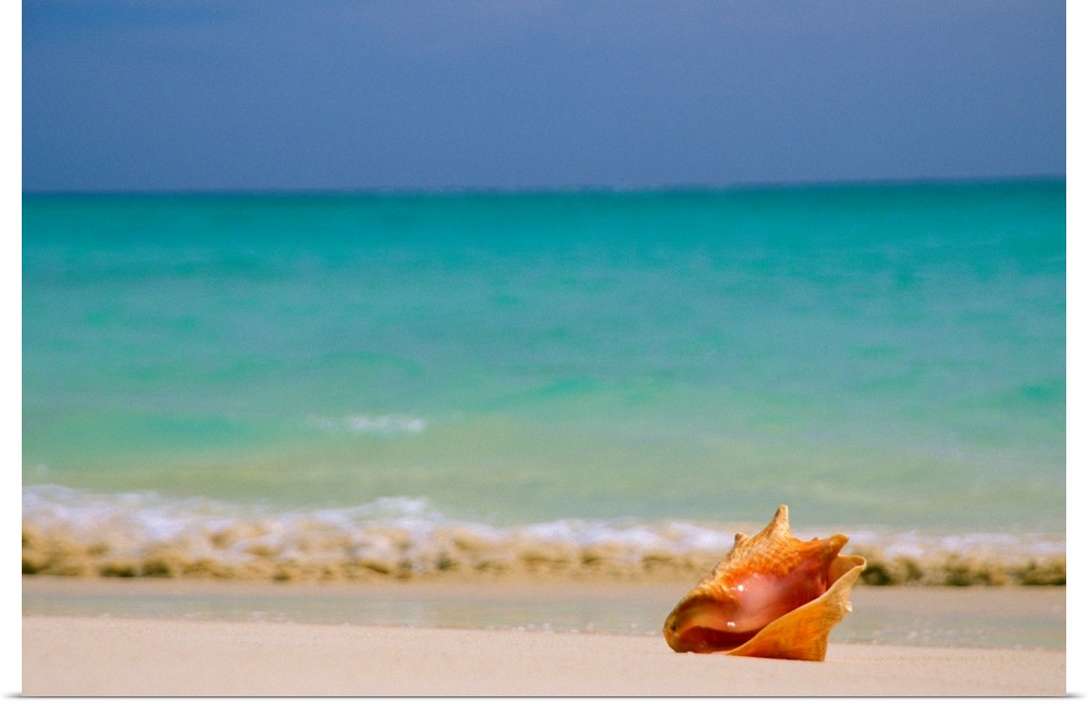 <p>Large, horizontal photograph of a single conch shell sitting along the shoreline, clear blue waters in the background beneath an open sky.</p>