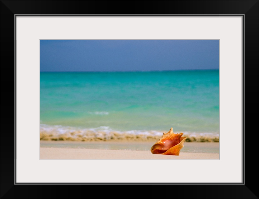 <p>Large, horizontal photograph of a single conch shell sitting along the shoreline, clear blue waters in the background beneath an open sky.</p>