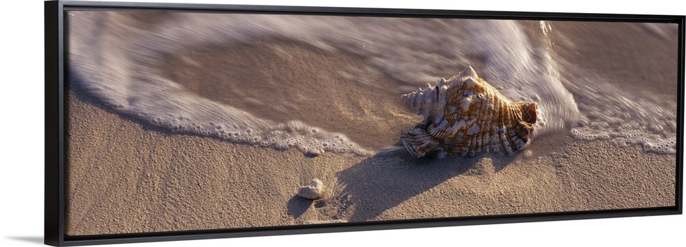 <p>A panoramic photograph that is a close up of a sea shell on the sandy shore as waves wash around it.</p>