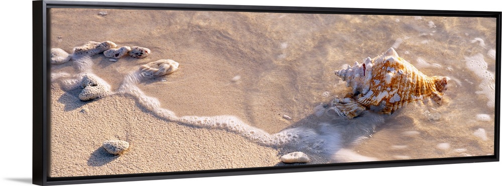 <p>A close up photograph turned into panoramic wall art of waves washing shells on to sandy a tropical beach.</p>