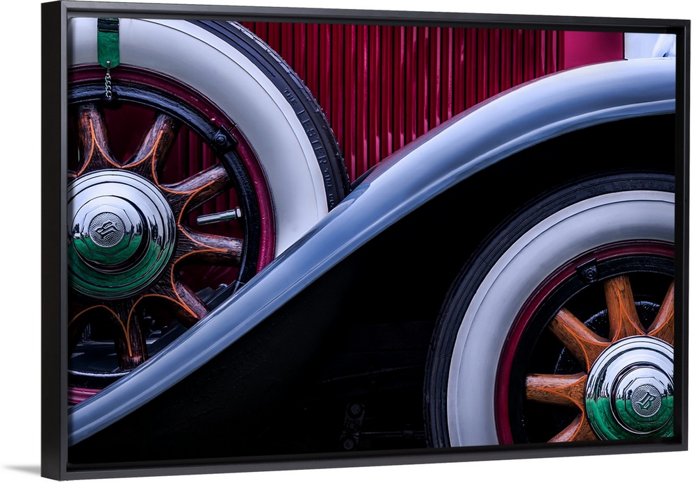 <p>Front and spare wheels on the side of a vintage car.</p>
