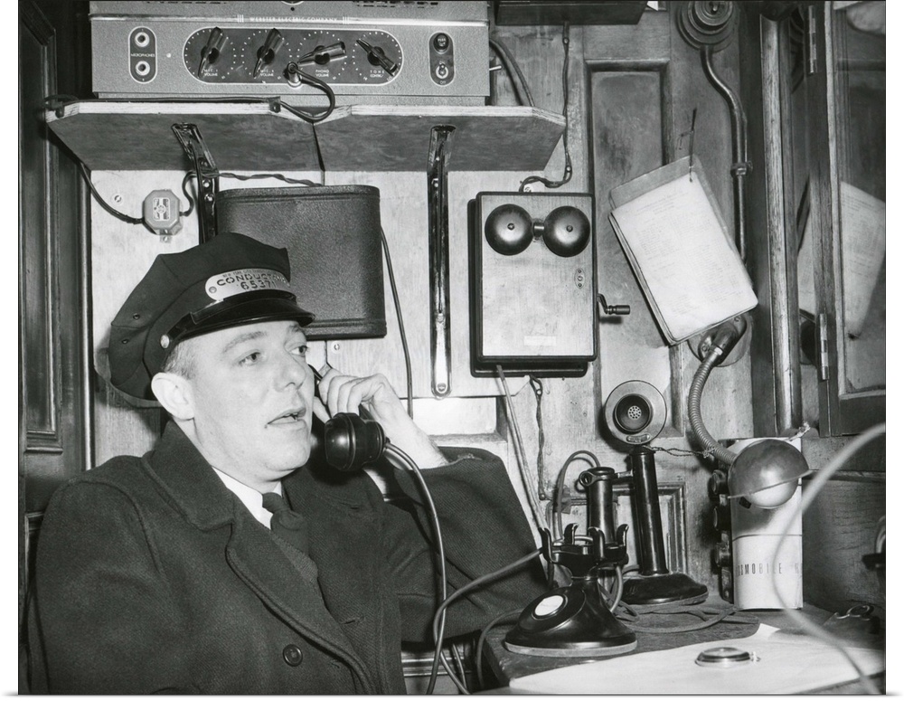 <p>Railroad conductor uses an on board telephone to communicate with other parts of the train. c. 1930's</p>