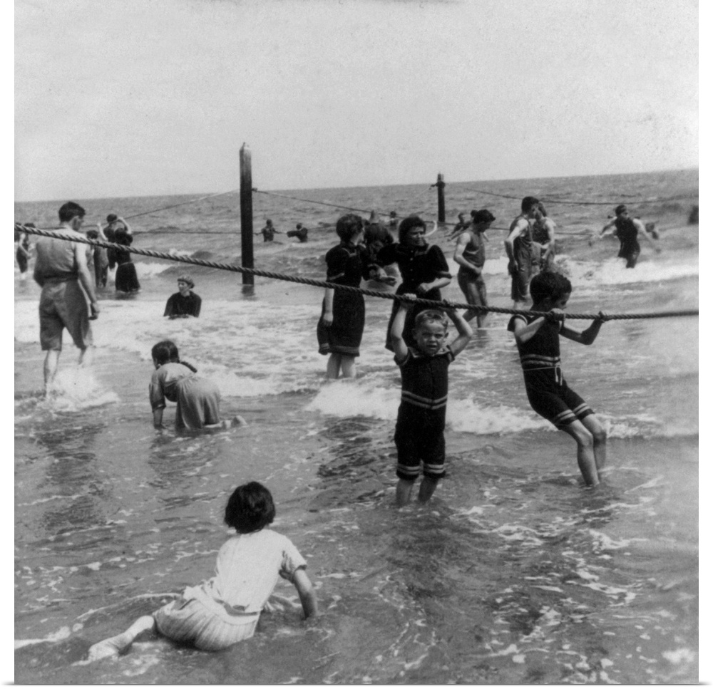<p>Children playing in surf at Coney Island, Brooklyn, New York. Stereograph, c1897.</p>