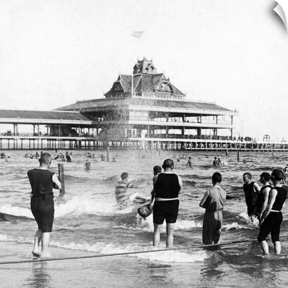 <p>Men sliding down a water toboggan in the surf at Coney Island, Brooklyn, New York. Stereograph, 1903.</p>