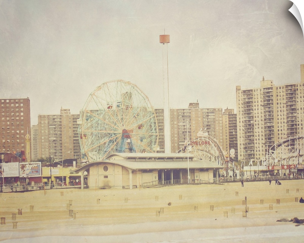 <p>The beach and amusement rides at Coney Island.</p>