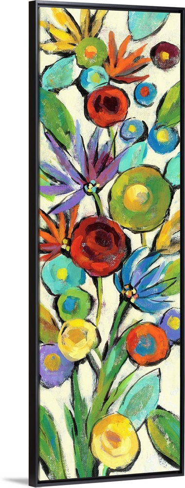 <p>Tall, rectangular painting of colorful wildflowers filling up the entire canvas on a neutral colored background.</p>