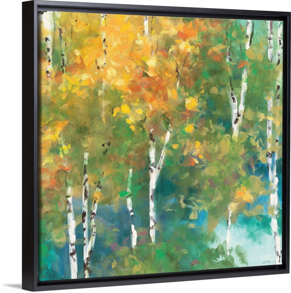 <p>Contemporary artwork of a forest of thin birch trees turning fall colors.</p>