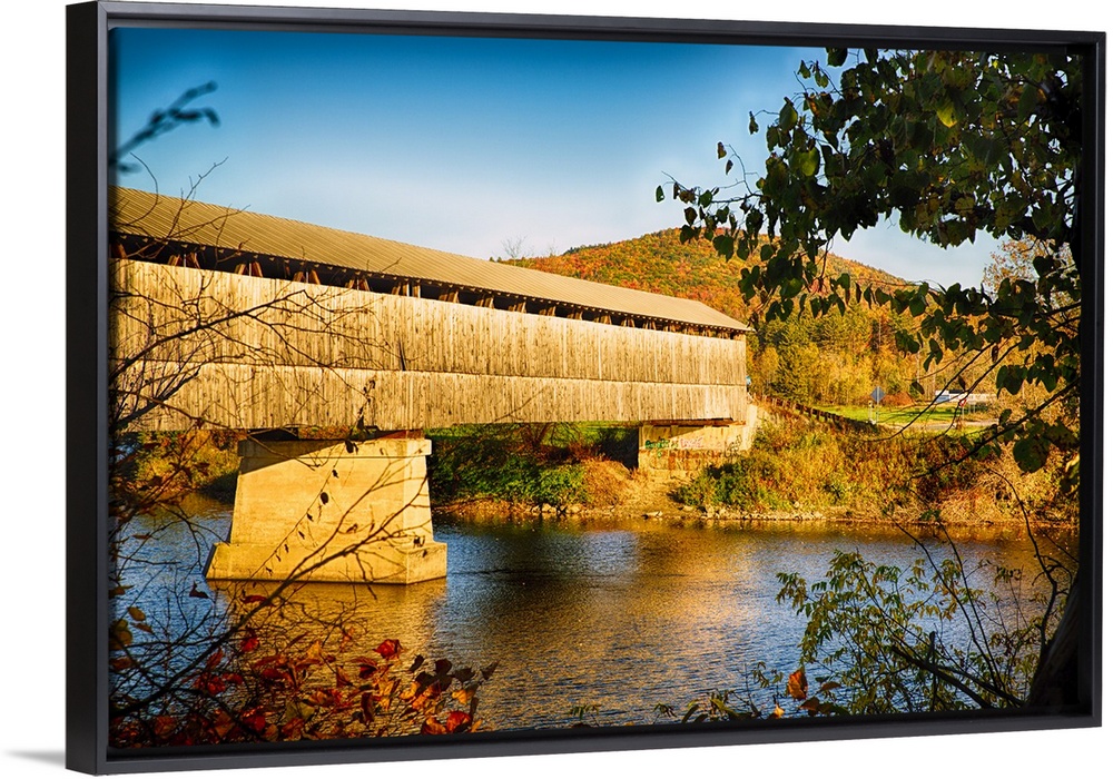 <p>A covered bridge over the river in late afternoon sunlight, New Jersey.</p>