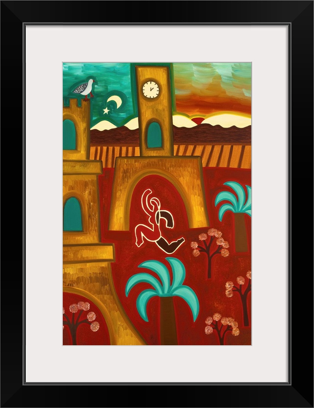 <p>Contemporary painting of a woman running through a courtyard.</p>