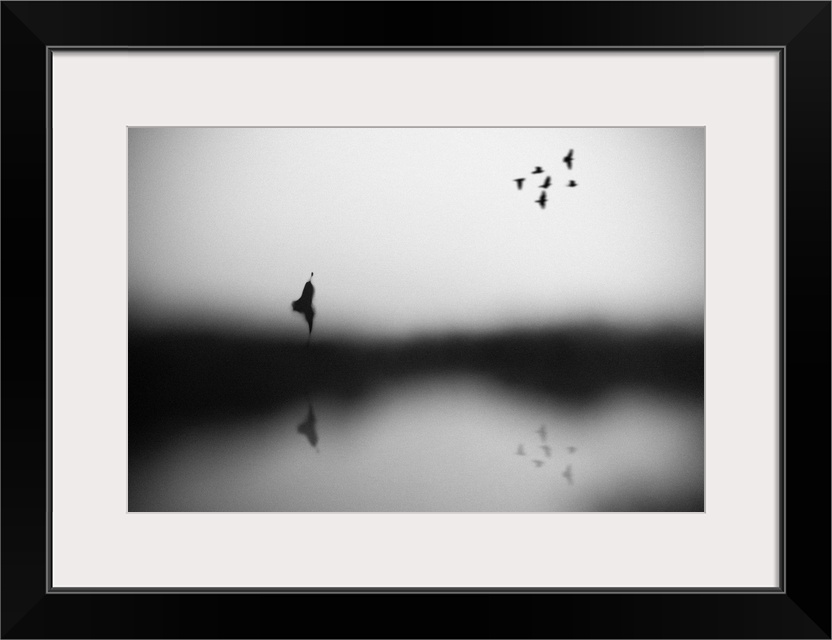 <p>Out of focus image of a figure walking by water with a small flock of birds overhead.</p>