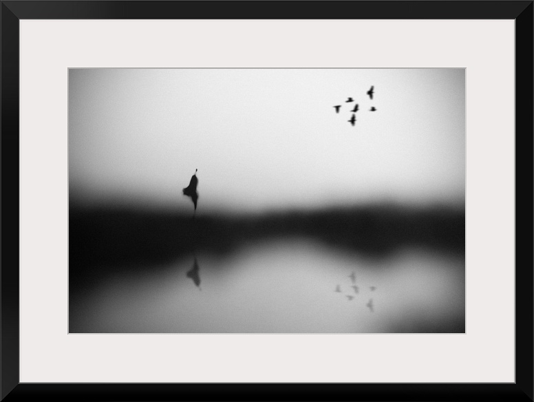 <p>Out of focus image of a figure walking by water with a small flock of birds overhead.</p>