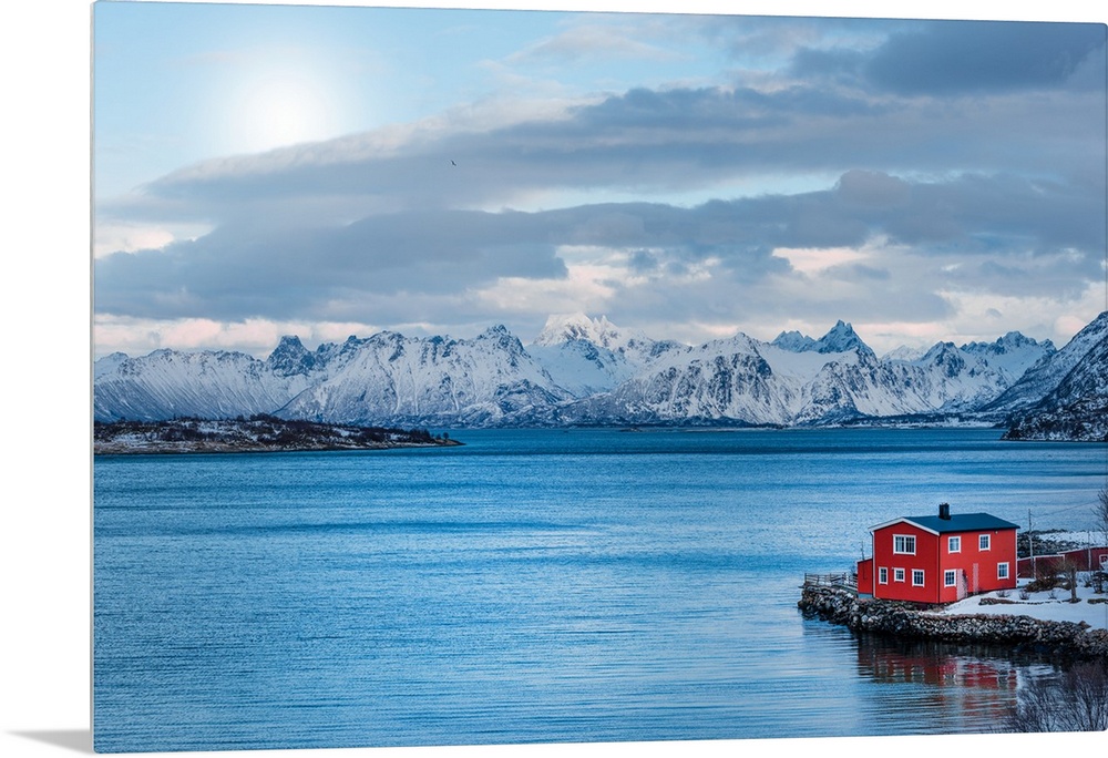 <p>A photograph of a red building sitting on the shoreline of a snowy landscape with mountains in the distance.</p>