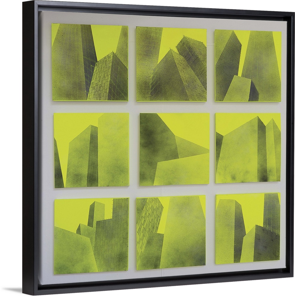 <p>Contemporary painting of green square tiles with geometric shapes in them.</p>