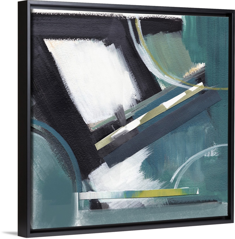 <p>Square abstract art in shades of blue, green, white, and black with some pieces glued on top creating depth and texture.</p>