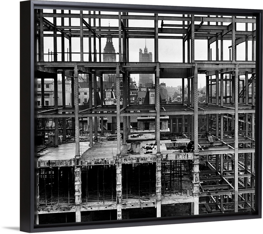 <p>The towers of Big Ben and the Houses of Parliament rise beyond a framework of metal girders, erected by the Ministry of Works, at Whitehall Gardens, between the Embankment and Whitehall. The multistory building will accommodate offices of the Board of Trade and of the Admiralty.</p>