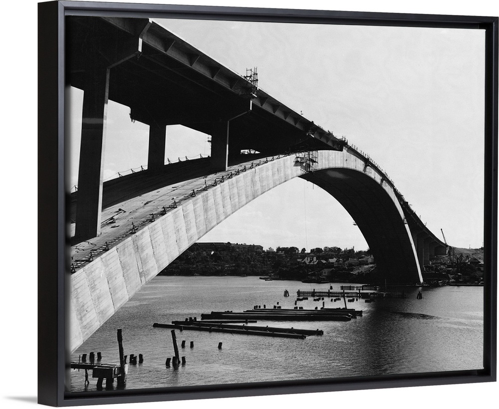 <p>The construction of the Gladesville Bridge in Sydney, which when completed will be the world's largest single span concrete bridge.</p>