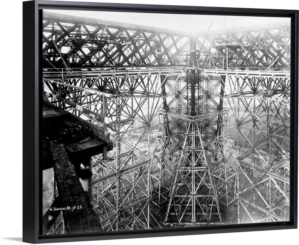 <p>Eiffel Tower under construction. Intricate mass of ironwork at the level of the first platform with temporary supporting structure. Horizontal girders of first platform were nearly 200 feet long.</p>