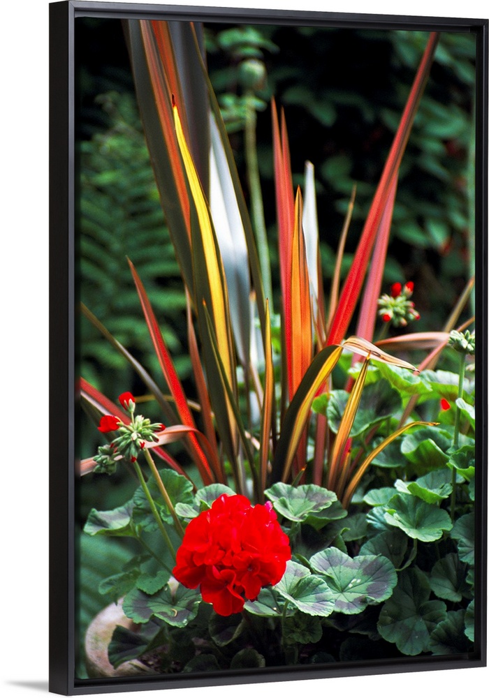 <p>Container plants. New Zealand flax (Phormium 'Flamingo') with geranium (Pelargonium sp.) in a pot.</p>