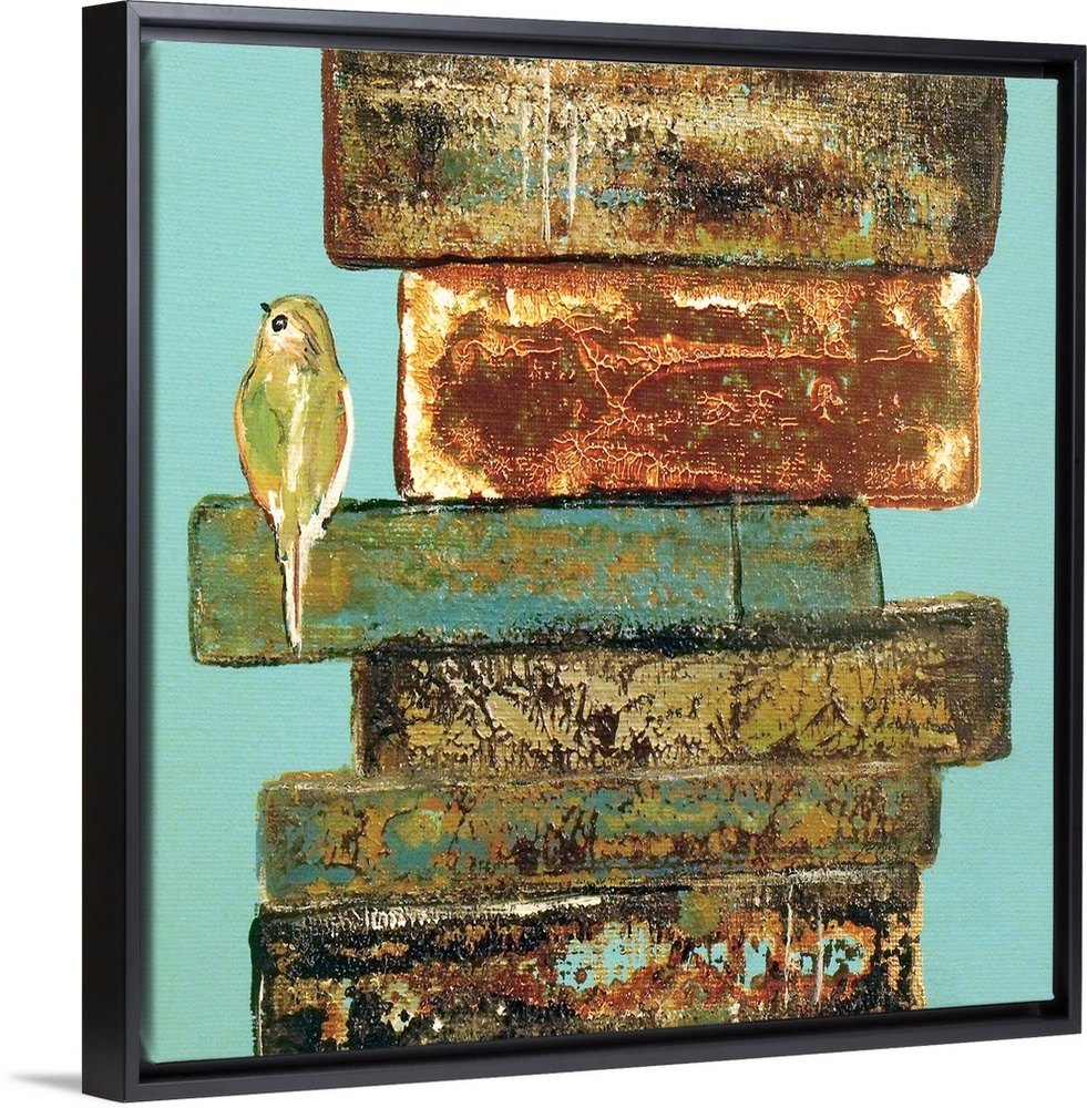 <p>A small bird perched on the edge of a stack of weathered books.</p>