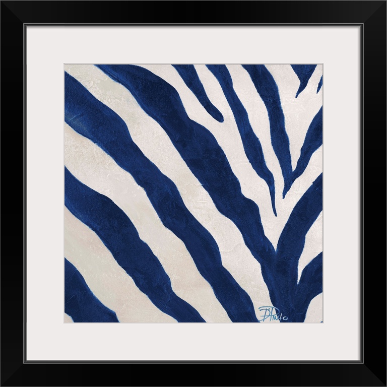 <p>Contemporary abstract painting of blue zebra stripes against white.</p>