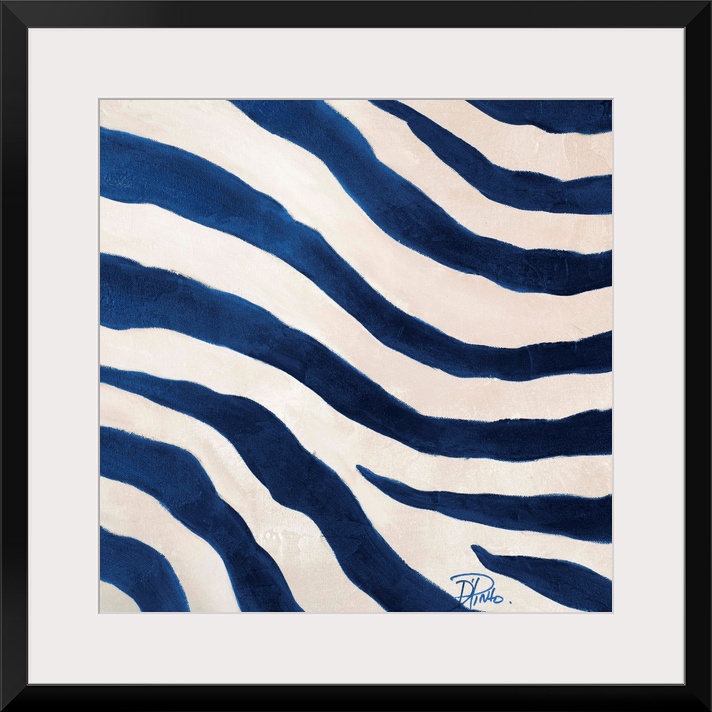<p>Contemporary abstract painting of blue zebra stripes against white.</p>