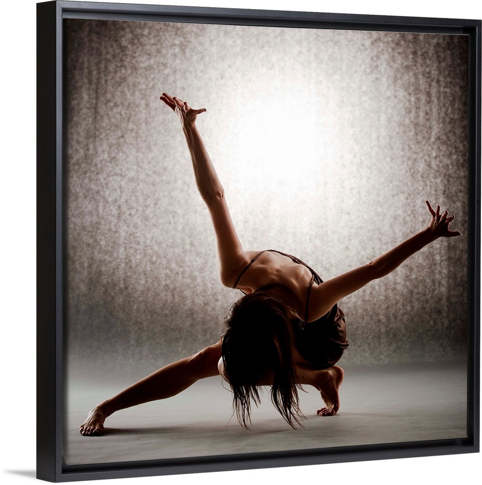 <p>Dancer performing contemporary ballet on grey seamless backdrop wearing brown dress.</p>