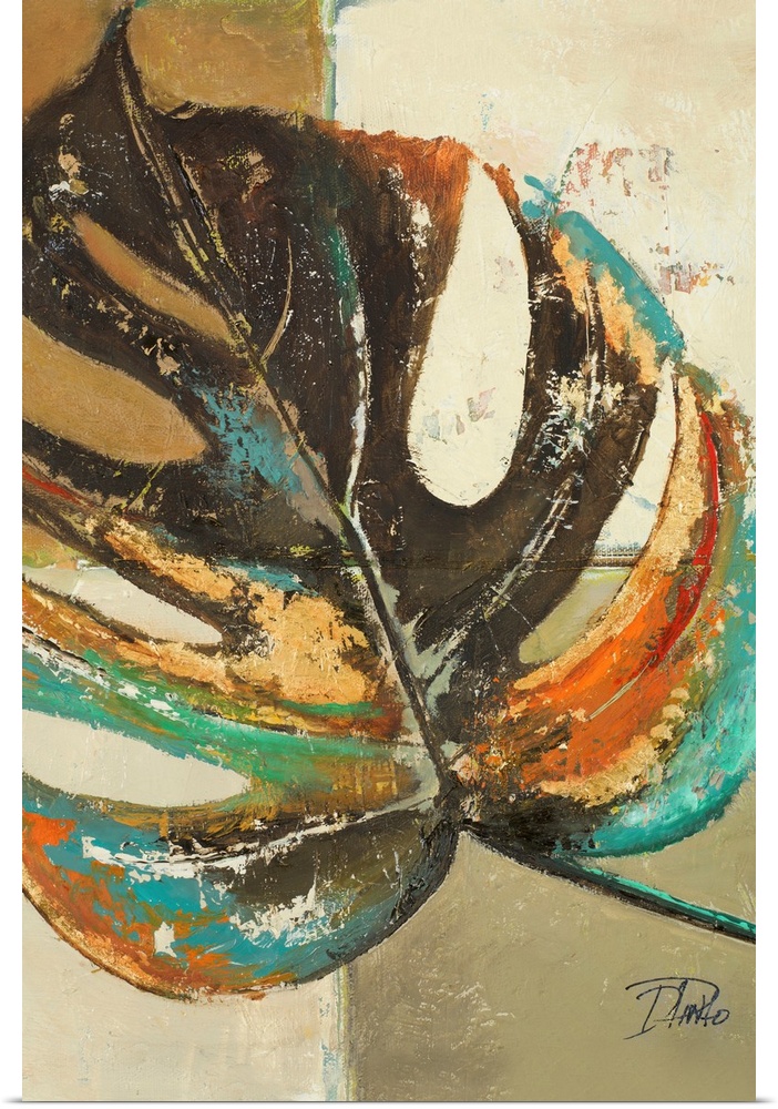 <p>A contemporary painting of a single colorful leaf with a tan squared background.</p>