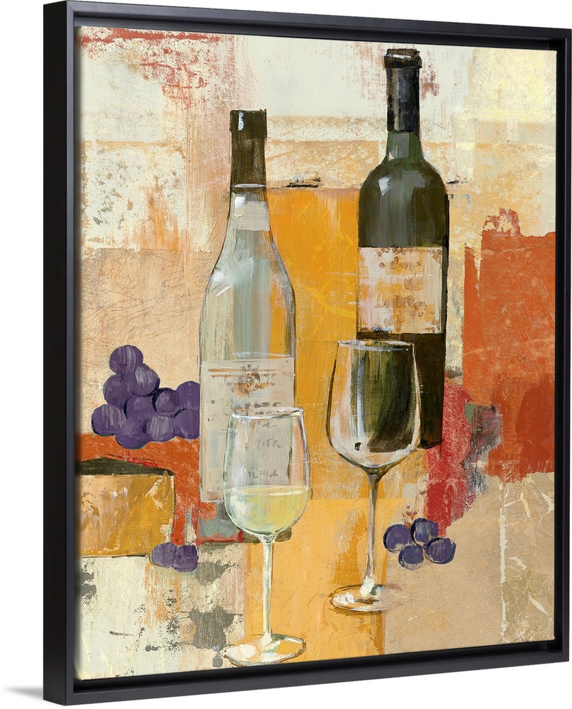 <p>Home docor painting of two wine bottles and glasses with some grapes on the side on a block-style textured background.</p>