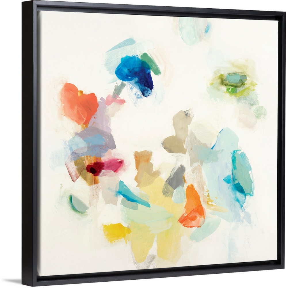 <p>Square abstract painting with pops of vibrant colors all over a white background.</p>