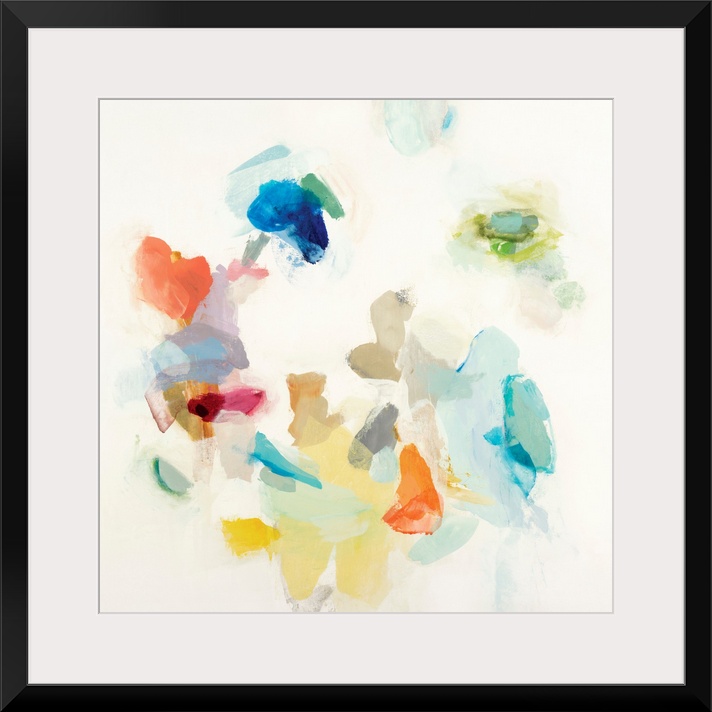 <p>Square abstract painting with pops of vibrant colors all over a white background.</p>