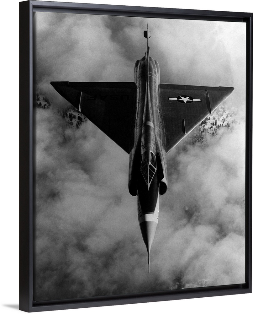 <p>A United States Air Force, delta-wing F-102A, interceptor aircraft in flight above cloud cover.</p>