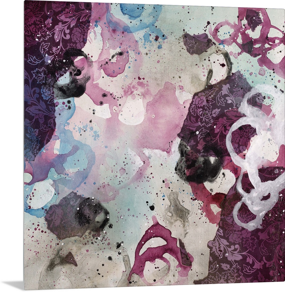 <p>Abstract painting using bright purple tones in splashes and splatters, almost looking like flowers.</p>