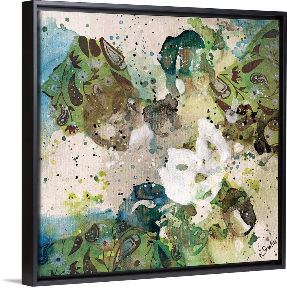 <p>Abstract painting using bright green tones in splashes and splatters, almost looking like flowers.</p>