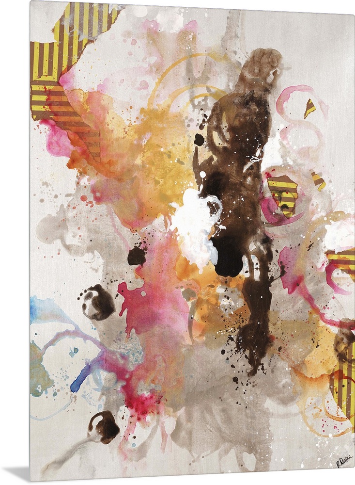 <p>Abstract painting of overlapping splatters, rings, and patches of various colors, including striped areas, on a light, neutral background.</p>