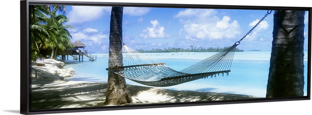 <p>Panoramic photograph of a hammock hanging between two palm along the shore of the Cook Islands, clear blue waters of the South Pacific in the background.</p>
