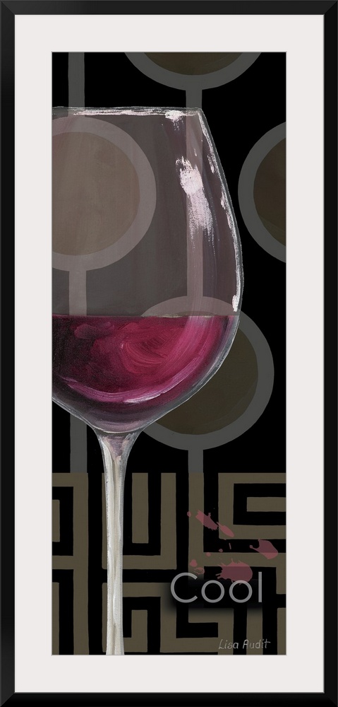 <p>Vertical panoramic mixed media artwork of a glass of wine with the text "Cool," with a line and circle geometric pattern in the background.</p>