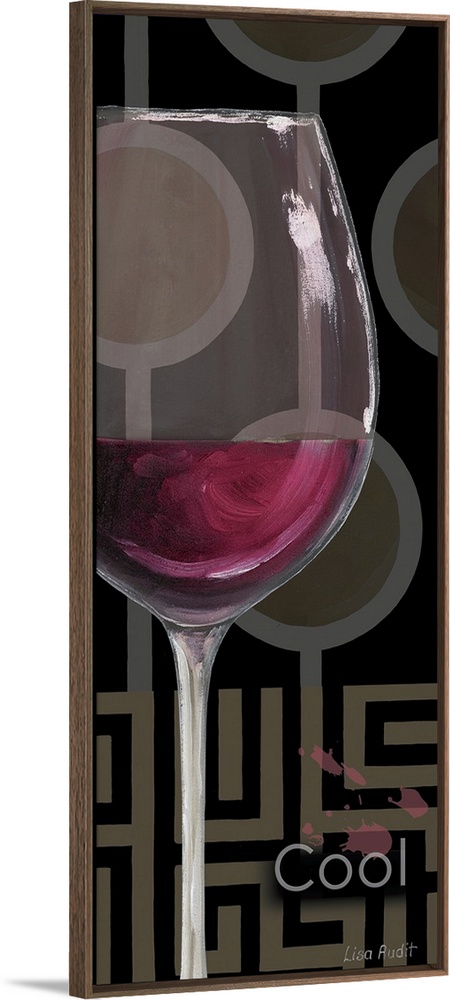 <p>Vertical panoramic mixed media artwork of a glass of wine with the text "Cool," with a line and circle geometric pattern in the background.</p>