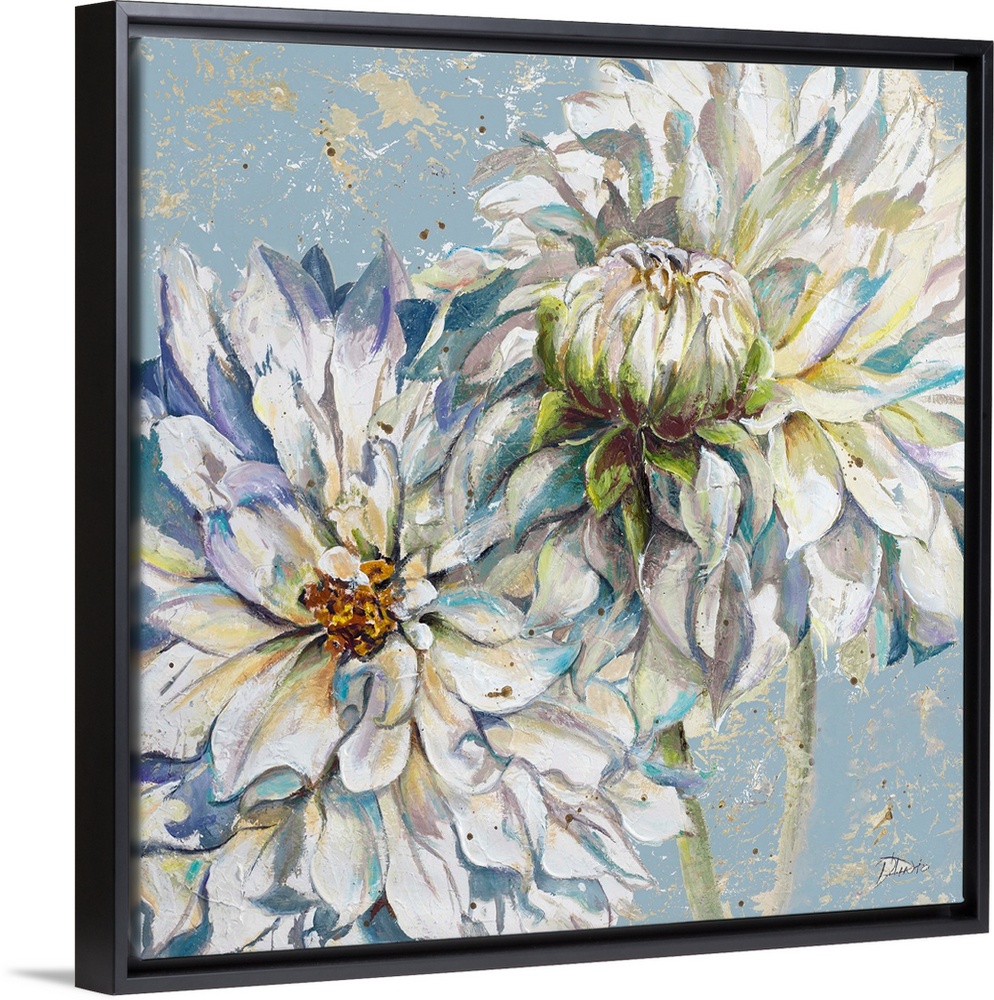 <p>A contemporary painting of two cool toned dahlias on a blue and tan background.</p>