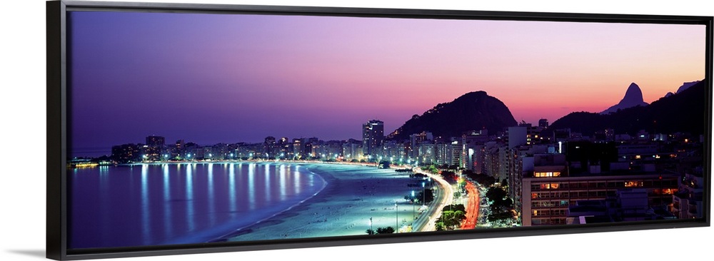 <p>Panoramic, giant photograph of buildings lit along Copacabana Beach at night, mountains in the background against a vivid sunset, in Rio de Janeir, Brazil.</p>