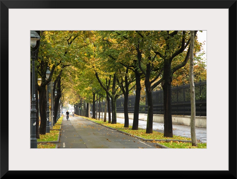 <p>Copenhagen, Denmark - A city bike path near a park is lined with trees. In the background is a person riding a bike. Horizontal shot.</p>