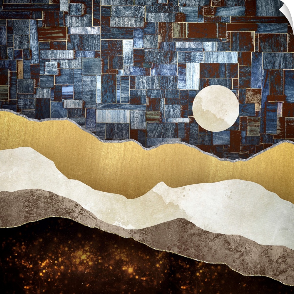 <p>Abstract depiction of a landscape with a geometric sky, blue and copper.</p>