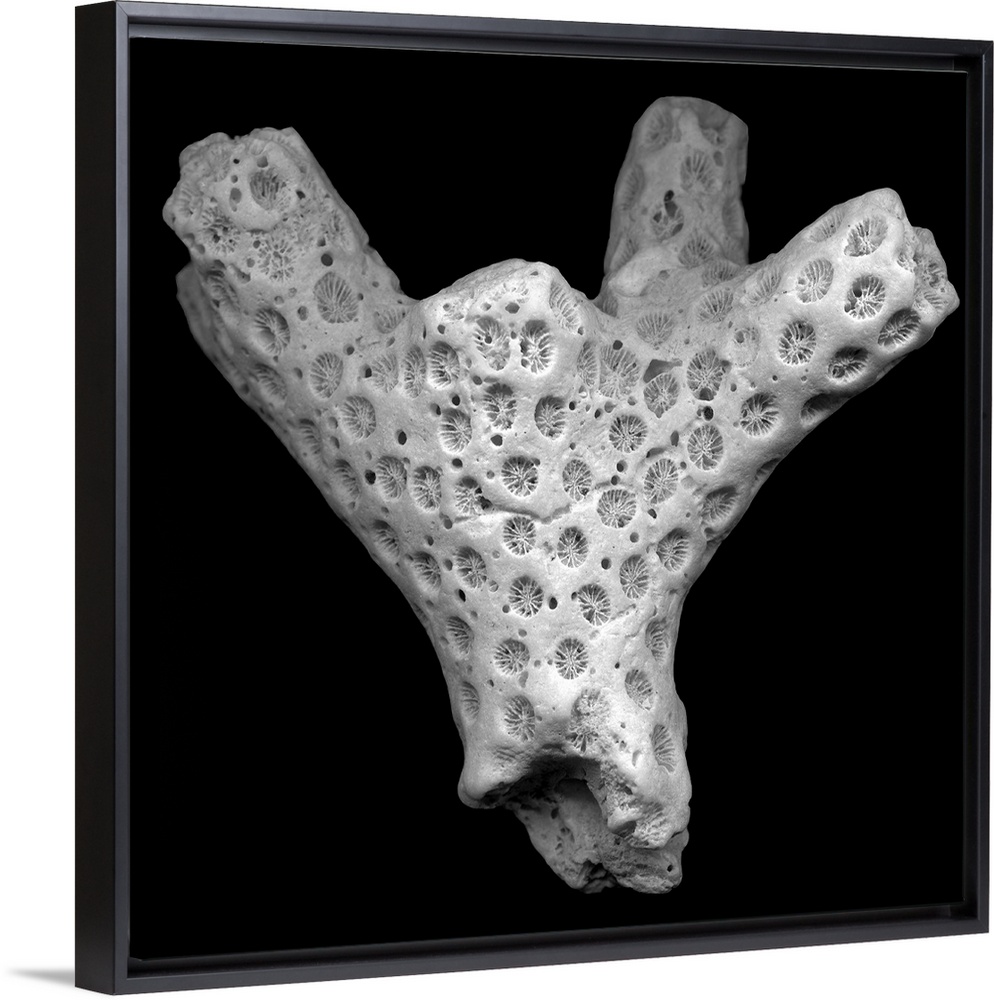 <p>An artistic photograph of a piece of coral close up that is in black and white on a flat black background.</p>