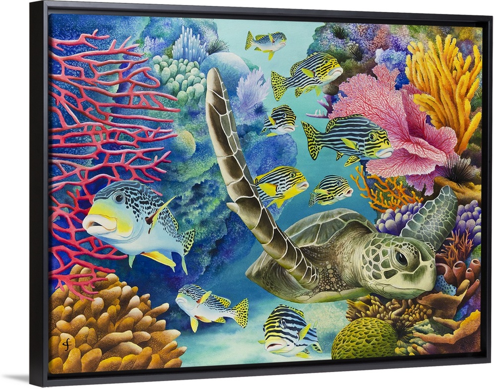 <p>Whimsy watercolor painting of a sea turtle a tropical fish swimming through a coral reef.</p>