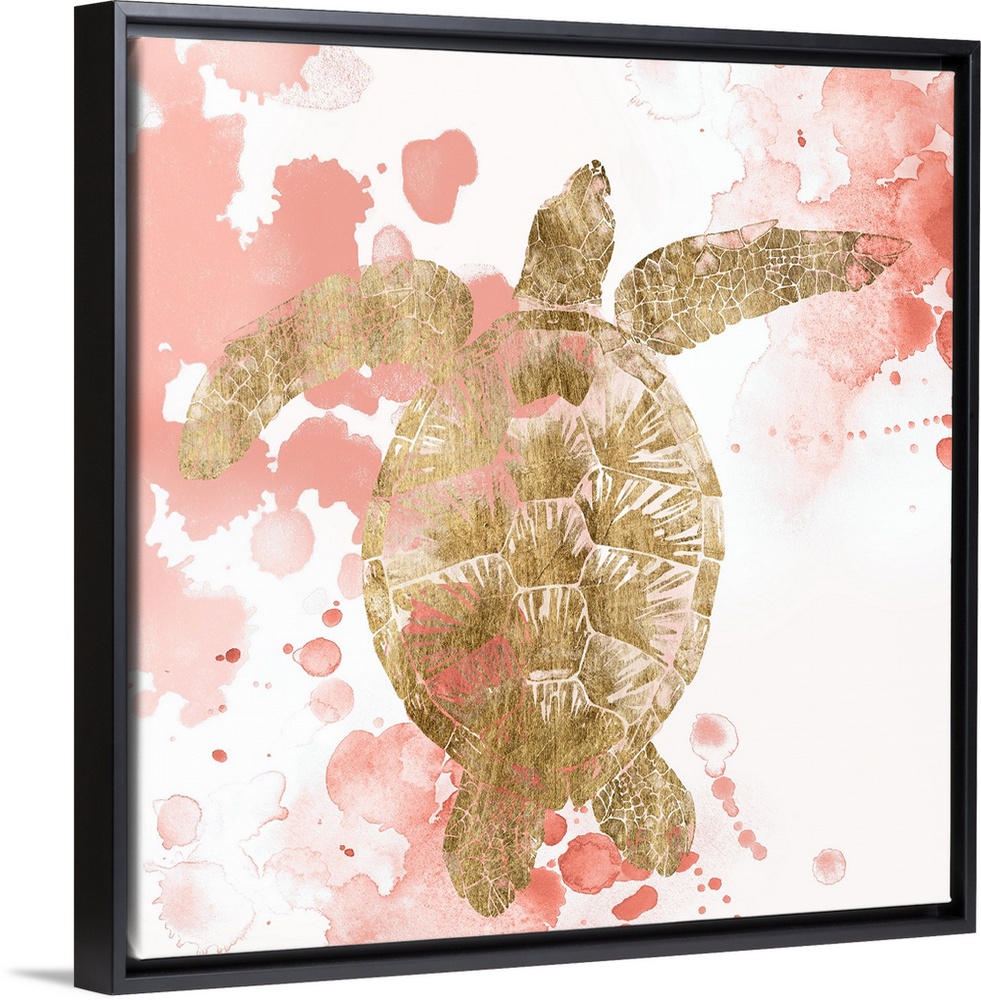 <p>A gilded sea turtle against a white background with splashes of coral paint.</p>